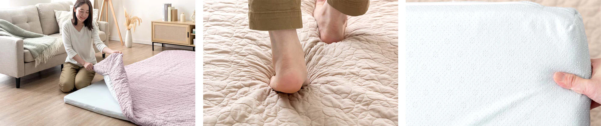 ▲カバーリング仕様(左)、素足で使う物だから清潔に(中央)、中材に滑り止め付き(右)カバーは、コルクベージュ、ミストグレー、ラベンダー、フォグブルーの4色で、サイズはS、M、Lの3対応展開となる。