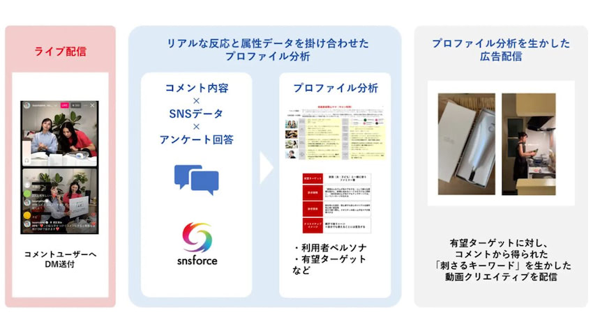 SNSの行動データとライブ配信中のコメント内容・購買データを掛け合わせた分析により、新たなデジタル広告を制作したところ、既存の広告より良好な獲得成果を記録する結果となったという。